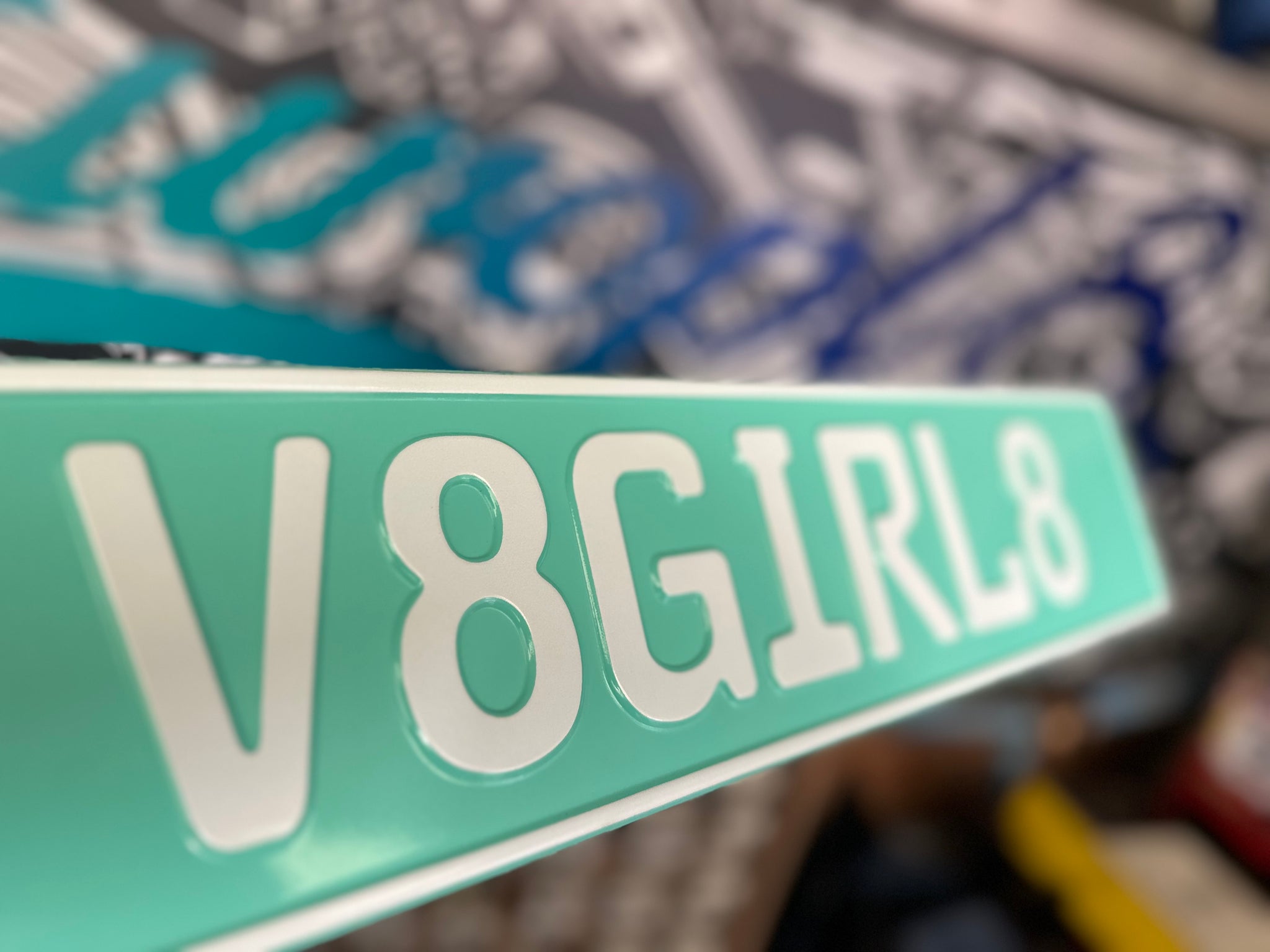 These are our premium quality coloured trucker plates. Supplied in the plate colour shown, but customisable with your choice of font style, font colour and wording.