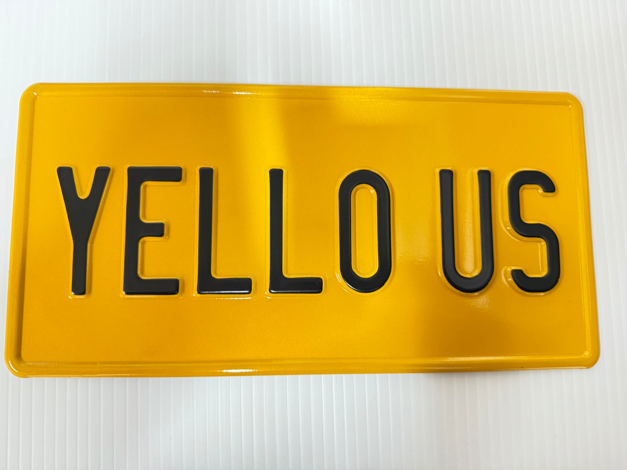 This is our USA style Yellow plate. The size is 300mm x 150mm. This plate is produced in a similar way to our other plates by stamping the desired characters into the plate and then applying the letter colour by running it though a hot foil process at 200 degrees celsius. There is an 8 character limit for these plates inc any spaces.